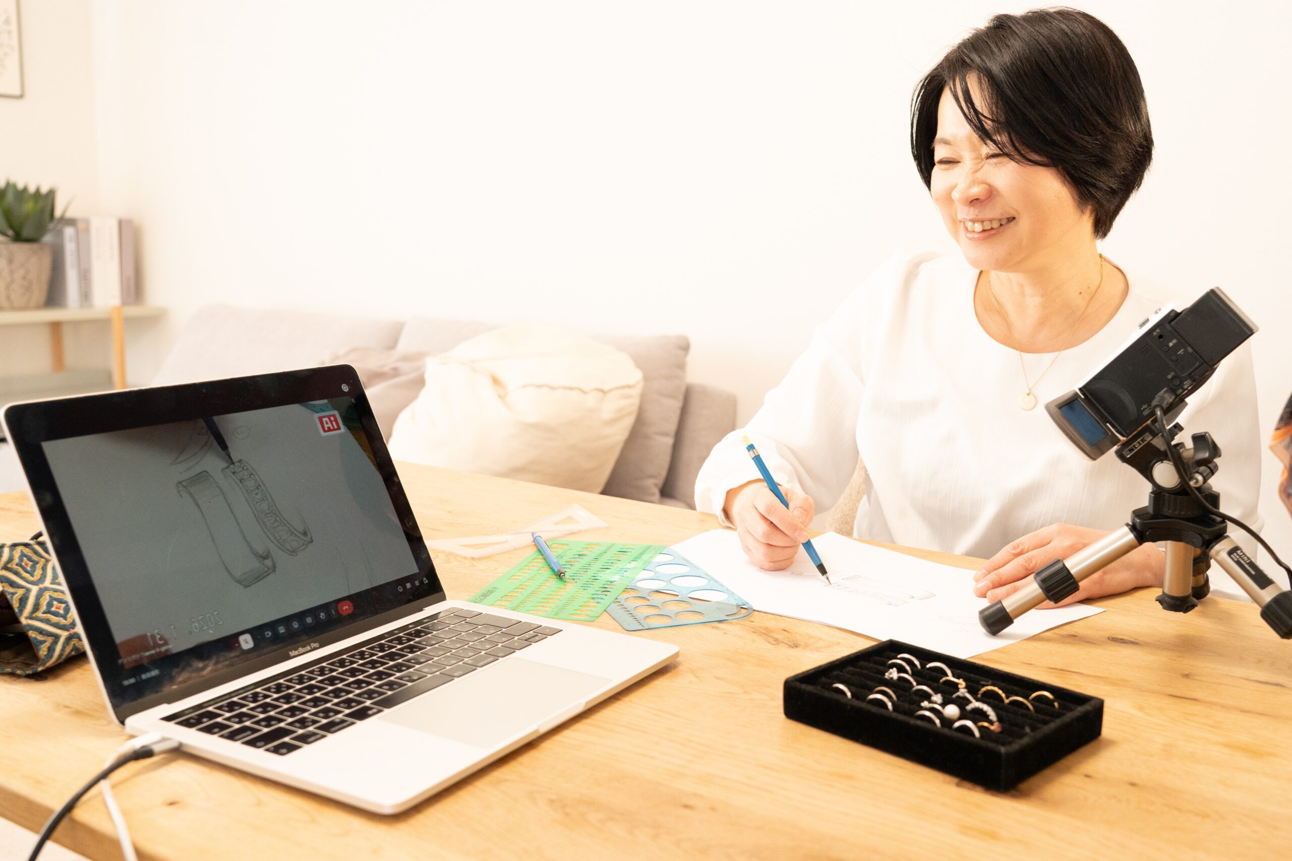 A 全国どこからでも、画面越しに「対面」と同じ体験ができます。デザイナーがスケッチを描き、形にしてゆく様子をリアルタイムでご覧いただけます。おふたりのお住まいが離れている場合にも、3人で画面上で打ち合わせる等、これまでも多くの遠方のお客様と、画面を通じて想いを形にしてきました。安心してご相談ください。