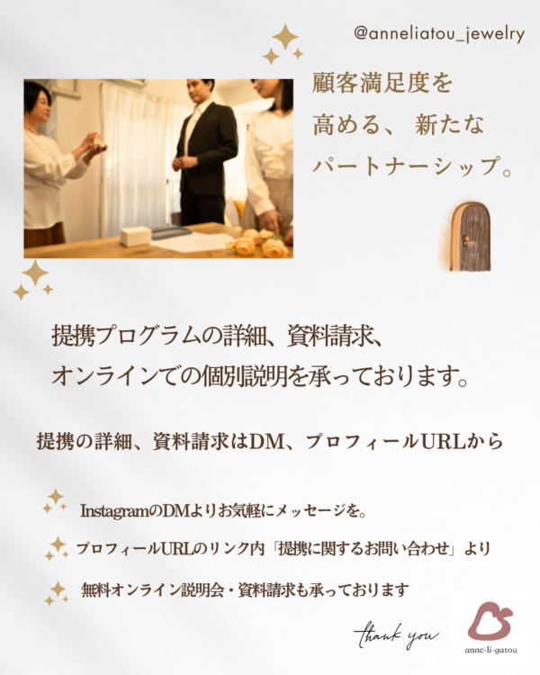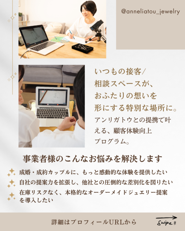 現在、結婚相談所様や結婚式場様において、「成婚・成約後のカップルへのアフターフォロー」や「他社との差別化」が大きな課題となっています。 アンリガトウでは、店舗に在庫を置くことなく、オンラインでプロのデザイナーと直接繋がる「ライブスケッチ」を通じた新しい指輪選びの体験を提供しています。