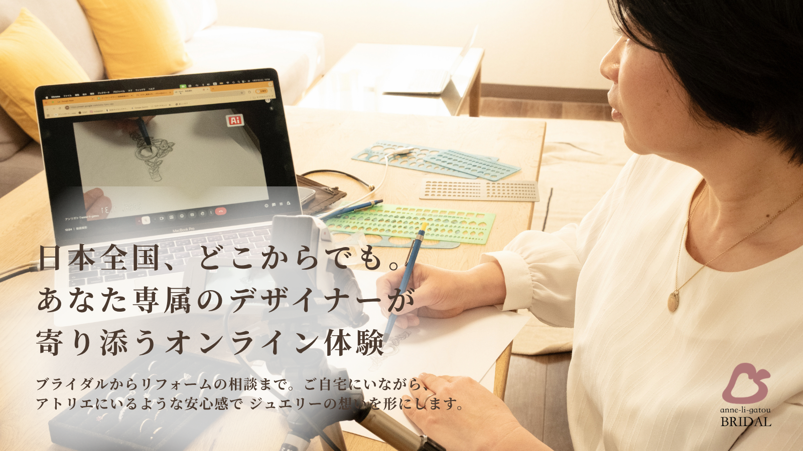A 全国どこからでも、画面越しに「対面」と同じ体験ができます。デザイナーがスケッチを描き、形にしてゆく様子をリアルタイムでご覧いただけます。おふたりのお住まいが離れている場合にも、3人で画面上で打ち合わせる等、これまでも多くの遠方のお客様と、画面を通じて想いを形にしてきました。安心してご相談ください。